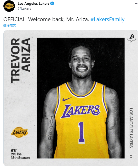 湖人官宣:欢迎重返湖人,阿里扎先生。