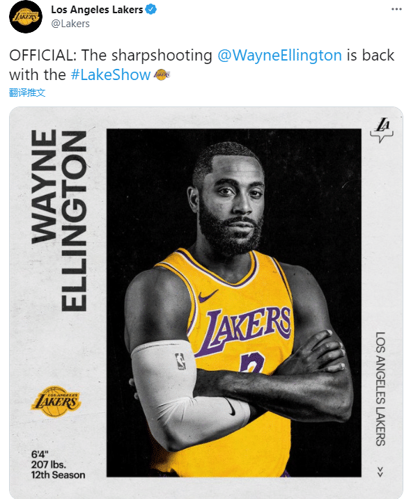 湖人官宣:欢迎神射手艾灵顿回归湖人。