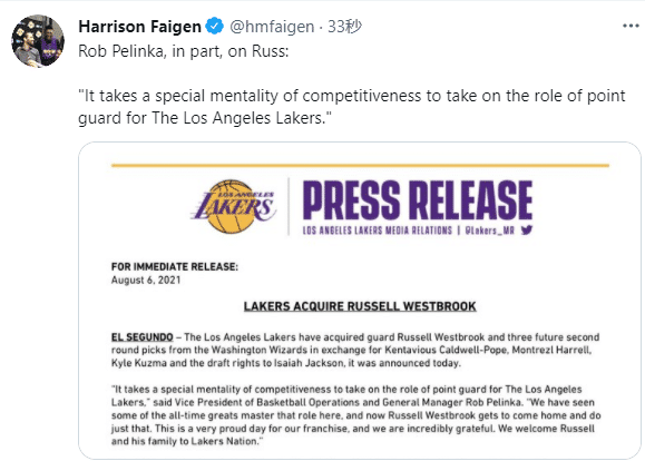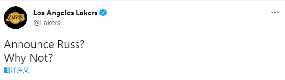 湖人官推晒威少身穿湖人0号球衣照,并且写道:官宣威少?为什么不呢?