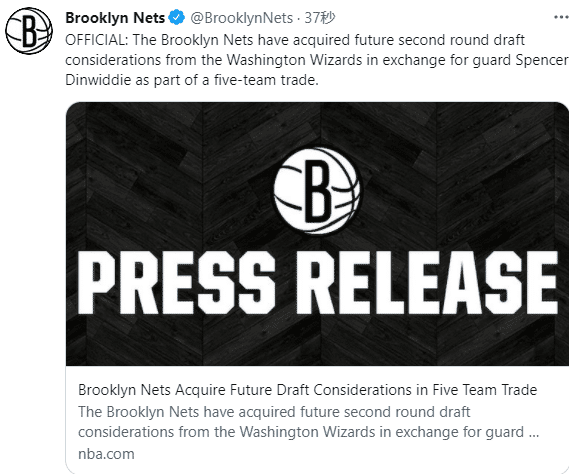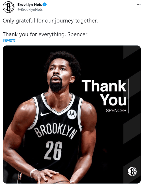 篮网官宣大交易达成之后,发推:感谢我们一起走过的旅程,谢谢你做的每一件事,丁威迪。