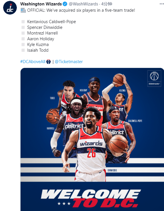 华盛顿奇才官宣,欢迎丁威迪、库兹马、波普以及哈雷尔等球员,发推写道:我们在五队大交易中得到6名球员。