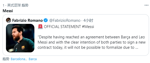 来源:24直播网08-06 10:4824直播网讯 北京时间8月6日,巴萨官宣梅西离队,由于经济和制度因素的制约,双方无法完成签约,因此梅西将不再为巴萨效力,球队为此深表遗憾。梅西正式离队引热议,冲上推特热搜榜第一名,美媒晒出梅西身穿湖人10号球衣的P照,火箭,马刺官方直接招募。