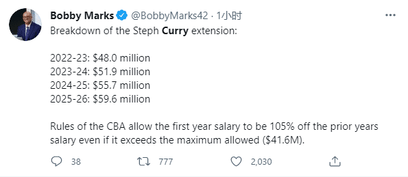 薪资专家Bobby Marks披露了库里新合同具体细节,他现在的合同还剩下一年,薪资是4580万美元。