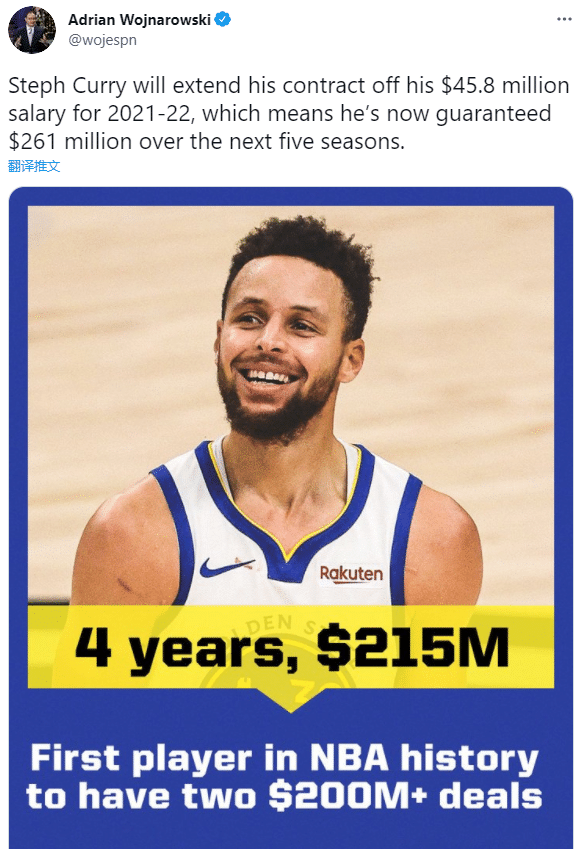 未来5年2.61亿!库里续约勇士成历史第一人 ,新合同细节曝光