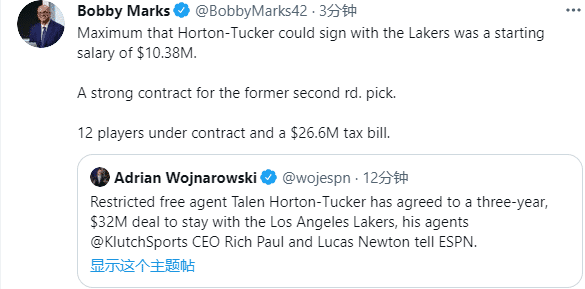 据名记沃纳罗斯基报道,湖人已经和霍顿-塔克达成3年3200万美元的续约合同,湖人很早就给塔克开出资质报价;塔克上赛季为湖人出战64常规赛,场均8.7分2.5篮板2.6助攻,年仅20岁的塔克未来可期。薪资专家Bobby Marks报道,霍顿-塔克合同的起薪是1038万美元。