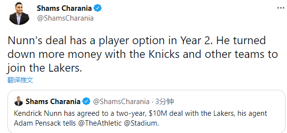 据名记shams报道,湖人两年合同签约纳恩,双方签下2年1000万美元合同,纳恩拥有球员选项,为了加盟湖人,纳恩拒绝了尼克斯以及其他球队更大的合同。
