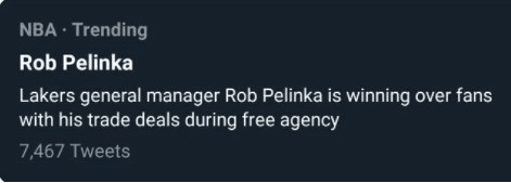 佩林卡的引援操作水准怎么样?湖人球迷说了算,最终佩林卡的引援操作获得球迷喜爱!如今佩林卡登上热搜,有关于佩林卡的社媒总数高达7467条,连续签约实力派老将,佩林卡顺势登上热搜不可避免,毕竟这是湖人队,还拥有詹姆斯、浓眉哥与威少。当然,也有不少记者打趣佩林卡应该考虑签回拜纳姆、尼克杨以及卡曼等湖人旧将。