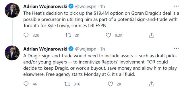 为了腾出空间,打造巴特勒+阿德巴约+洛瑞+德罗赞的冲冠阵容,热火已经开始行动。他们执行了德拉季奇价值1940万美元的球队选项,NBA记者沃纳罗斯基报道称,热火此举就是为先签后换洛瑞准备筹码,他们需要德拉季奇配平合同,再加上选秀签或者年轻球员和猛龙交易。