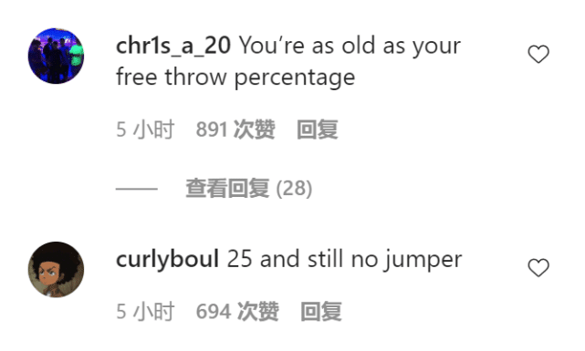 西蒙斯的庆生动态,也引来了不少球迷的评论。大家的花式吐槽亮了。一个球迷写道:“你的年龄和你的罚球命中率一样。”这当然有些夸张,但也说明了球迷们对西蒙斯罚球命中率的不满。还有球迷写道:“都25了,还没跳投。”这也是西蒙斯的尴尬,每一年都表示要练投篮,但现在反而越投越没谱,难道这么多年练了个寂寞?