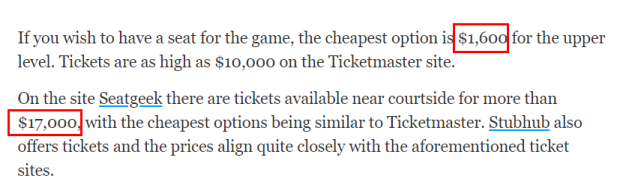 如果你想得到一个坐下来看球的位置,最便宜的选择是接近顶棚的位置。在那里看球,基本上也是看大屏幕,因为从那个位置看球场上的球员,可能都分不清谁是谁。这样的球票最低也要1600美元。在Tichetmaster上,最贵的球票得要10000美元。Seatgeek上还有更贵的场边票,目前的价格已经超过17000美元。