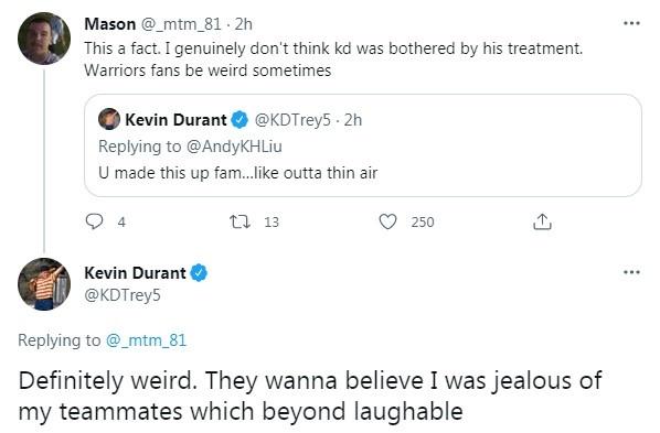 球迷会深度猜测很多问题,而杜兰特本人在社媒上的态度我们也都知道,一直是犀利回应,举几个杜兰特昨日互动中的例子: