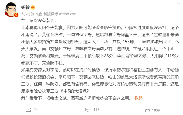集体看衰太阳?著名詹黑嘲讽,杨毅:我错了,艾顿根本防不了字母哥!