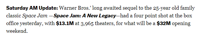 第一、《空中大灌篮:新传奇》昨日的票房不仅击败了上映第二周的漫威大片《黑寡妇》(昨日票房800万美元),还将为制片方华纳兄弟影业创造疫情以来旗下影片的北美最高首周末票房纪录。