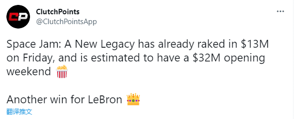 美媒Clutch Points晒照恭喜詹姆斯,发推:《空中大灌篮:新传奇》首日票房高达1300万美元,首周末票房将达到3200万美元,勒布朗的另一场胜利。