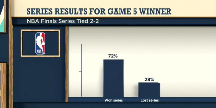 总决赛G5的输赢对总冠军的归属影响很大,因为这是NBA历史第30次总决赛天王山大战,在之前的29场比赛中,拿下总决赛天王山的球队有72%的概率夺得总冠军。