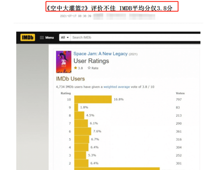 据悉,满分是100分的话,詹姆斯的《空中大灌篮2》在某网站的得分只有32分。而该影片在IMDB上的评分也实在太低了,只有3.8分(满分10分)。如果从评分和票房来看,这算是一部烂片了。