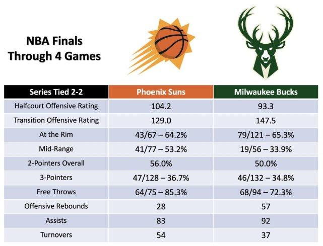 总决赛前4战数据对比:雄鹿快攻效率147.5太狠!太阳54次失误扎心
