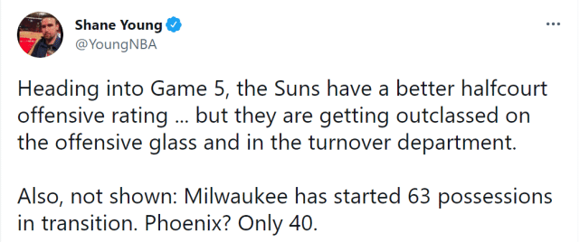 肖恩-杨在列出这一数据表的同时,也配上了自己的解析:“在进入第五场比赛前,太阳的半场阵地进攻效率更好,但他们在前场篮板和失误方面被对手完爆。另外,表格上没展示的数据是雄鹿打了63个回合的快攻,而太阳只有40个回合。”