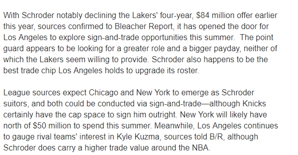 Jake Fischer报道,施罗德曾拒绝湖人4年8400万美元续约合同,他的拒绝让湖人得到了在今夏以先签后换方式将其送走的机会,目前湖人方面并不愿意为为施罗德提供顶薪合同和更重要的队内角色,湖人将施罗德视为升级球队阵容的最佳筹码。