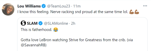 最近一段时间,詹姆斯忙着宣传自己的新电影,也很享受观看儿子布朗尼的比赛。妻子萨瓦娜还上传了一段詹姆斯看儿子比赛直播的视频,他在电视前大吼大叫,激动万分。路威转发了这一动态写道:“我了解这种感觉,同时感到紧张和骄傲。”