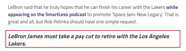 文中写道:“勒布朗说他真的希望在湖人结束职业生涯,那很棒,但罗勃-佩林卡需要提出一个简单的请求:要在湖人退役,勒布朗-詹姆斯必须接受降薪。”