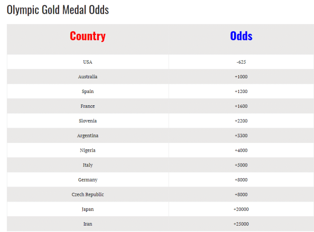 排名第5-12位的依次是斯洛文尼亚(+2200)、阿根廷(+3300)、尼日利亚(+4000)、意大利(+5000)、德国(+8000)、捷克(+8000)、日本(+20000)和伊朗(+25000)。伊朗是最不被看好的球队,金牌赔率垫底。