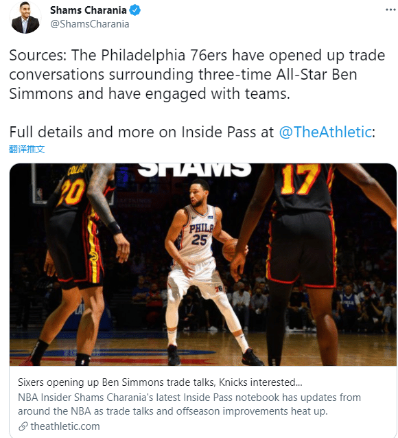 据TA记者shams报道,费城对于交易西蒙斯持开放态度,他们已经和多支球队谈判过了,目前他们向别队索要一位全明星;24岁状元西蒙斯还剩下4年约1.5亿美元的大合同。