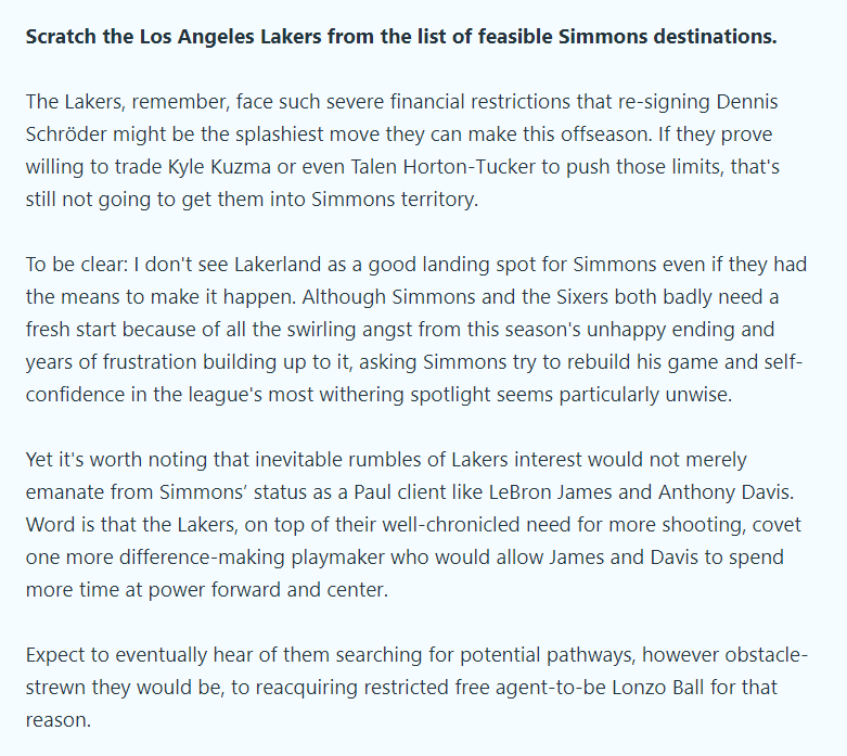 Marc Stein还表示湖人不在西蒙斯下家的名单上,受到薪资空间的限制,他们无法参与西蒙斯的交易;并且直言即使湖人想办法参与西蒙斯交易,他并不看好这笔引援,不过由于西蒙斯和詹姆斯、浓眉是同一个经纪人,湖人会陷入西蒙斯交易流言之中。