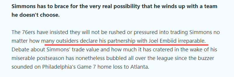 名记Marc Stein根据报道,西蒙斯和恩比德之间的关系已经无法挽回,但费城并不急于交易西蒙斯,现在至少有骑士、步行者、森林狼、国王和猛龙五支球队有意引援西蒙斯。