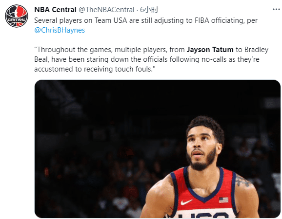 此前名记海耶斯透露美国男篮有几名球员还没有适应国际篮联的规则,他表示:在比赛中,杰森-塔图姆、布拉德利-比尔等多名球员一直盯着裁判,因为他们习惯于造接触犯规却没有得到哨子,造成这种局面的原因是这些球星已经习惯了NBA明星哨。