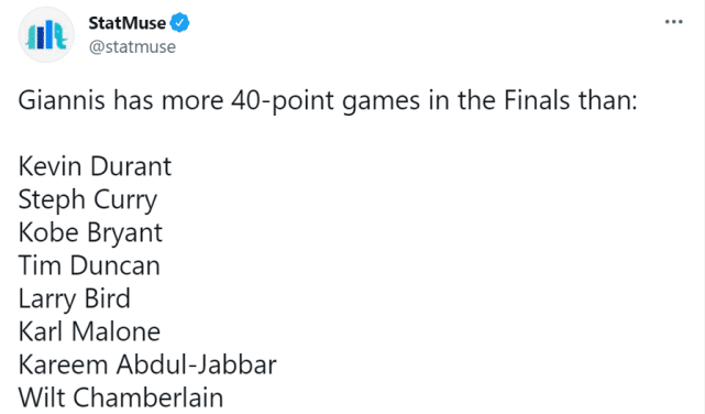 来源:24直播网07-13 11:1624直播网讯 北京时间7月13日,在总决赛第三场20分大胜太阳后,目前雄鹿大比分1比2落后太阳。字母哥过去两场表现不可思议,连续两场送出40+10。在总决赛两次砍下40分,字母哥目前并列历史第7,仅次于杰里韦斯特、詹姆斯、乔丹、奥尼尔、贝勒、里克巴里。而杜兰特、库里、科比、邓肯、拉里伯德、卡尔马龙、贾巴尔、张伯伦这些历史级巨星,在总决赛都是仅仅只拿过1次40分。