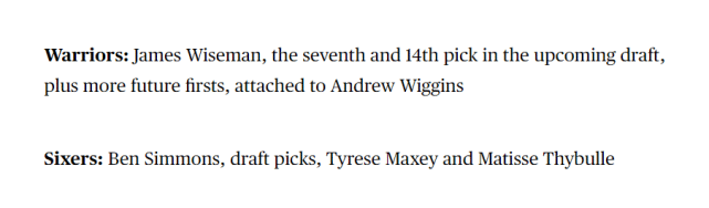 斯雷特相信勇士的报价会很有竞争力。他们能够提供的筹码包括榜眼秀怀斯曼、今年的7号签和14号签,未来更多的首轮以及用来配平薪金的维金斯。不过,美媒并不是很看好勇士,毕竟,如果他们打造水花+利拉德的组合,外线火力的确更猛了,但防守端的身材过于矮小,会存在不小的隐患。