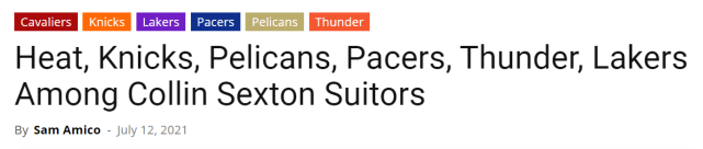 来源:24直播网07-13 10:5324直播网讯 北京时间7月13日,据名记萨姆-阿米克报道,消息源透露,热火、尼克斯、鹈鹕、步行者、雷霆和湖人队都在评估塞克斯顿的交易。此前有消息称,骑士已经将22岁的新星塞克斯顿摆上货架。
