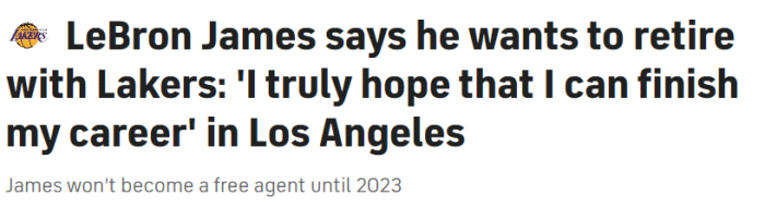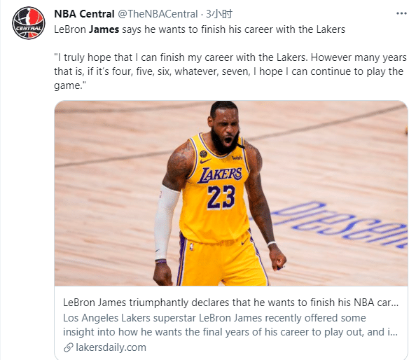其实,詹姆斯已经多次表态想要在湖人退役,如今詹姆斯不仅强调要在湖人结束生涯,而且透露退役时间是4-7年,换句话说,詹姆斯至少再打4年,至少打到40岁。