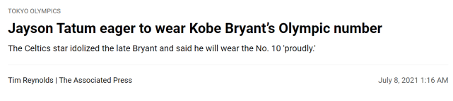 科比在湖人效力时穿过8号和24号,但他在帮助美国男篮夺得两块金牌时,穿的都是10号球衣。塔图姆在国家队穿过10号,并将在东京奥运会上再次身披这个号码,目标是帮助美国男篮连续第四次夺得奥运金牌。