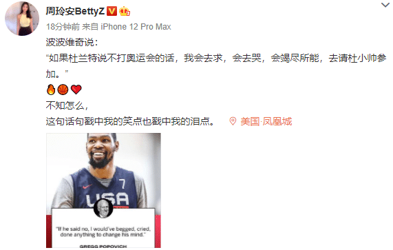 兑现承诺!波帅调侃哭求杜兰特参加奥运会,名记:戳中笑点泪点
