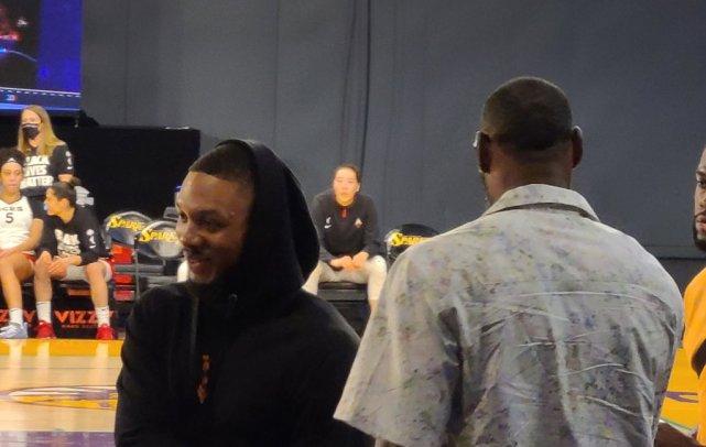 之所以这张照片和配文引起球迷的关注,还在于那天利拉德可不是一个人在场边看WNBA比赛,他还碰到了詹姆斯。两人在场边击掌拥抱,让湖人球迷遐想万千。