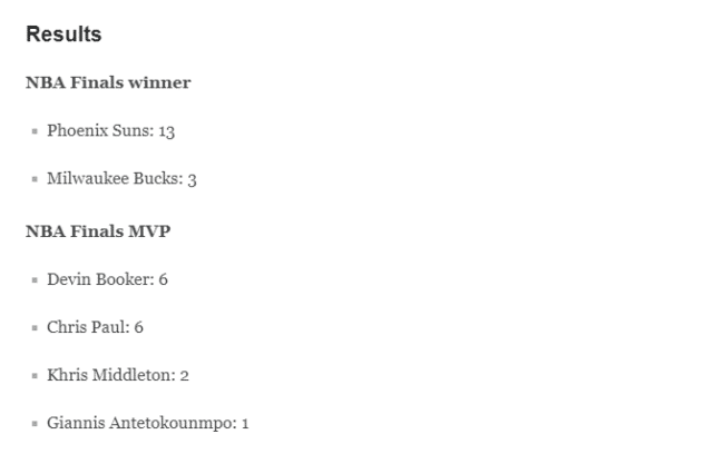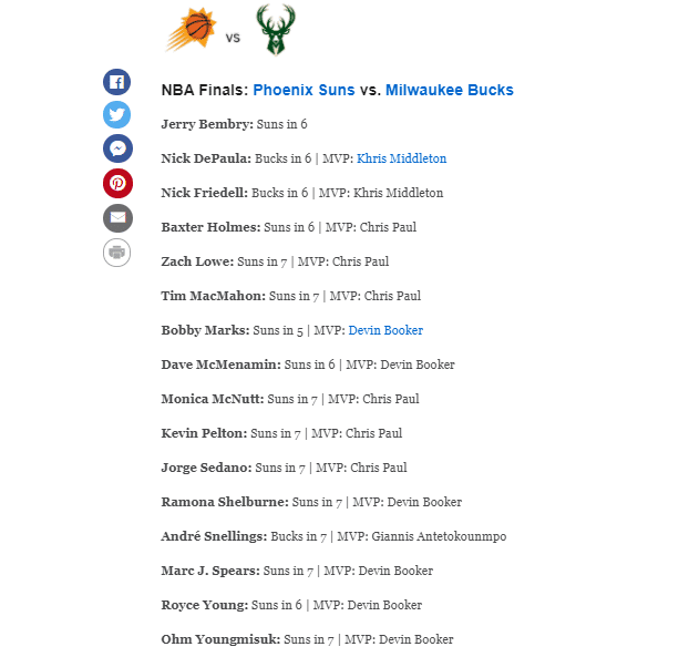 除了杰里-本布里,其余15位专家还预测了FMVP的归属。6位专家看好保罗,6位专家看好布克,另有2位专家看好米德尔顿,只有1位专家把票投给了归期未定的字母哥。