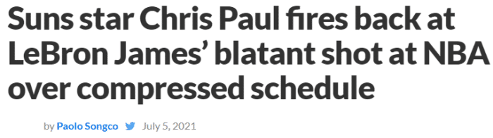 《CP》记者颂科直言,保罗和詹姆斯明显站在两个角度看待问题。詹姆斯和他的湖人是本赛季伤病的受害者,但保罗是球员工会主席,在赛季前他们会考虑到这个问题,而太阳队则是季后赛期间少有的能够一直保持健康的球队,这也和球队医疗团队、球员个人状态相关联。值得一提的是,在湖人被太阳淘汰后,詹姆斯就没有再和保罗有过社交上的沟通,包括保罗带队杀入总决赛,詹姆斯也没有任何祝贺的表示,以他们之间的感情来看,这还是比较意外的。