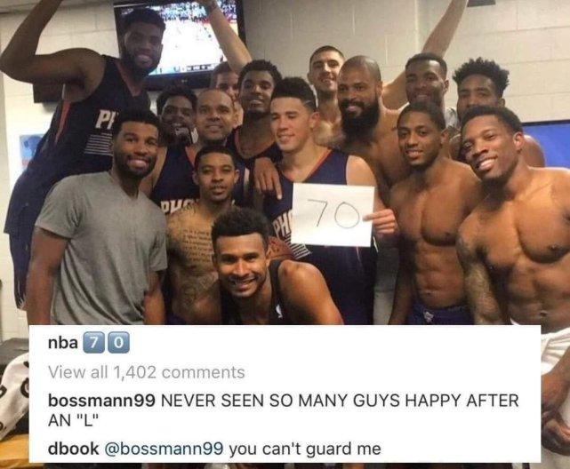 NBA官方媒体晒出了这张照片,当时效力凯尔特人的克劳德第一时间出现在评论区,嘲讽布克和太阳:“从没看到这么多人在一场失利后还如此开心。”布克回怼克劳德:“你根本防不住我。”