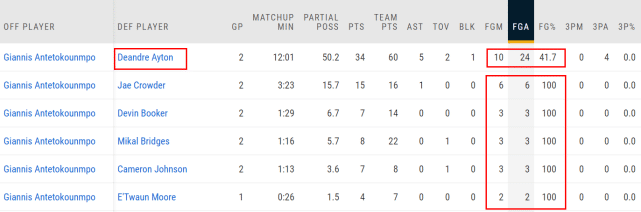 官网的数据显示,艾顿作为字母哥的第一防守人时,字母哥的投篮命中率只有41.7%,24投10中,三分球4投0中,命中率0%。