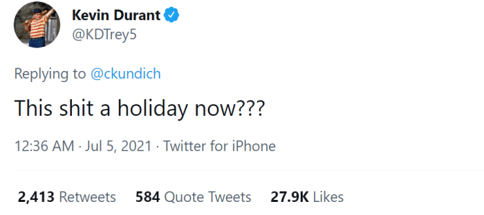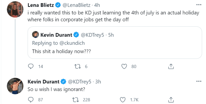 当地时间7月4日,还真是美国的一个法定节日。最搞笑的是一个球迷回应了杜兰特的“节日言论”。他写道:“我真希望KD刚刚知道7月4日(当地时间)是一个真正的节日,在公司上班的人可以休息一天。”杜兰特回怼道:“所以,你希望我很无知?”