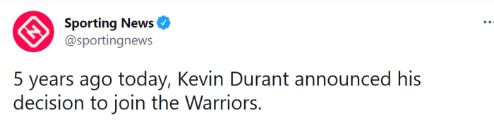 杜兰特宣布加盟勇士5周年!本人搞笑开怼:现在这已经成了节日?