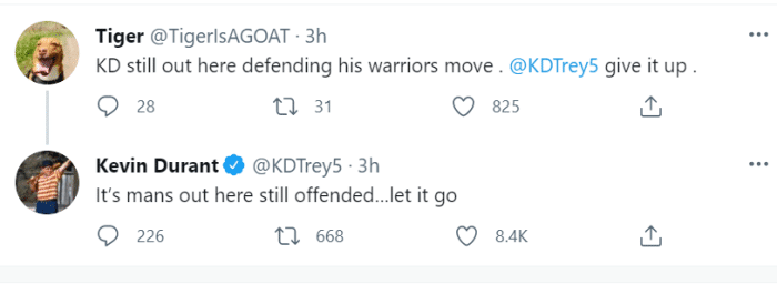 还有一个球迷写道:“KD还在为自己加盟勇士的举动辩解,放弃吧。”杜兰特回应道:“那是因为依然有人觉得受到冒犯,还是算了吧。”