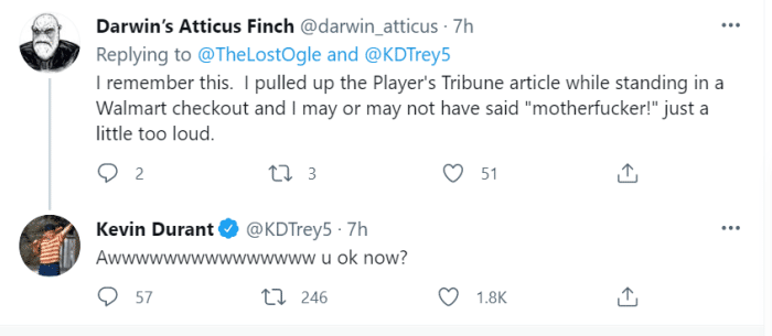 一个球迷写道:“我记得这一刻。当时我在超市正要结账离开,刷到了他在球员论坛上的那篇文章,我可能有点大声地骂了句脏话。”杜兰特回应道:“你现在还好吧?”