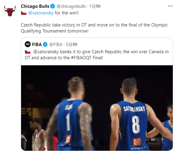 萨托兰斯基1.4秒绝杀终结加拿大男篮的奥运梦,赢球后公牛官方第一时间恭喜萨托兰斯基带队赢球,恭喜他们淘汰加拿大从而晋级决赛继续争夺奥运资格。