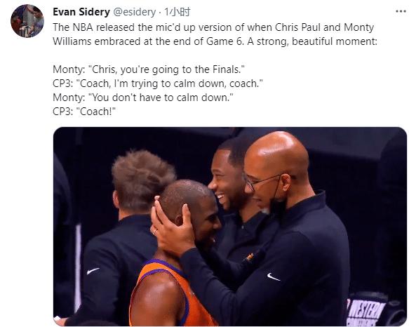 而最后时刻保罗扎进蒙蒂怀里的那一幕更是让人印象深刻,美媒爆料当时两人的对话内容,保罗喊了三次教练,蒙蒂表示“克里斯,你要进总决赛了”保罗回应“教练,我正努力冷静下来”蒙蒂再说“你不必控制情绪,尽情庆祝吧”眼含泪水的保罗露出了笑容!