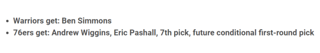 勇士送出维金斯、帕斯卡尔、7号签和未来的一个首轮签,得到西蒙斯。这笔方案应该能让费城满意,他们得到两个即战力,还有两个首轮签。勇士方面得到西蒙斯的同时,也能实现赢在当下的目标。