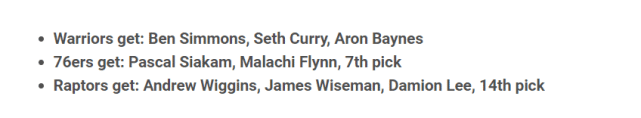 勇士完全可以拉来第三方,来完成一笔交易。美媒给出的方案是,勇士得到西蒙斯、塞斯-库里和贝恩斯,费城得到西亚卡姆、弗林和勇士的7号签;猛龙得到维金斯、怀斯曼、李和14号签。