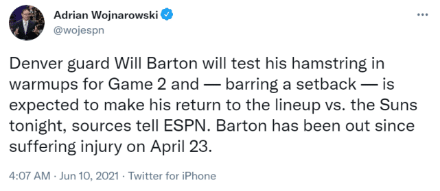 太阳的保罗已经接近康复状态,而对手掘金也传来利好的消息。据名记沃纳罗斯基报道称,掘金后卫威尔-巴顿将在今天G2赛前热身测试自己的腿筋,若无意外,他将在这场比赛中迎来复出。巴顿在当地时间4月23日受伤后一直处于缺阵状态,他已经连续缺席了20场比赛(13场常规赛+7场季后赛)。